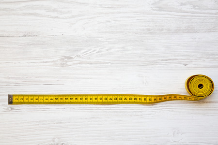 Yellow measuring tape on white wooden background, top view. From above. Copy space.