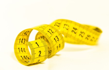 Close Up Tailor Measuring Tape on the yellow Background, Perspective view of spiral measuring tape, Close up of slimming concept