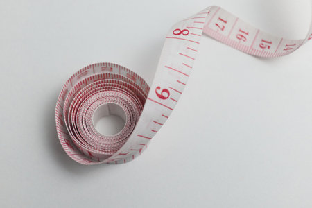 White measuring tape on red background. Measurement of length and circumference. Lose weight and get fat.