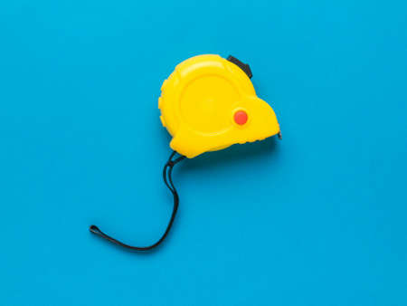 Folded yellow measuring tape on a blue background. Minimal concept of measuring instruments. flat lay.