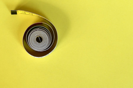 Centimeter ribbon of yellow color on a yellow background. A tool for measuring distances. Centimeter for sewing and needlework.