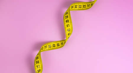 Close Up Tailor Measuring Tape on the yellow Background, Perspective view of spiral measuring tape, Close up of slimming concept
