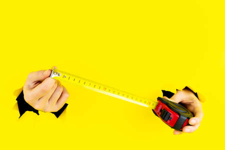 Female hands is holding measuring tool, construction tape measure roulette in torn holes of yellow background. Apartment, house renovation, repair. Modern architectural building project concept.