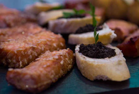 Closeup of bruschetta appetizers with savoury paste topping presented in rows