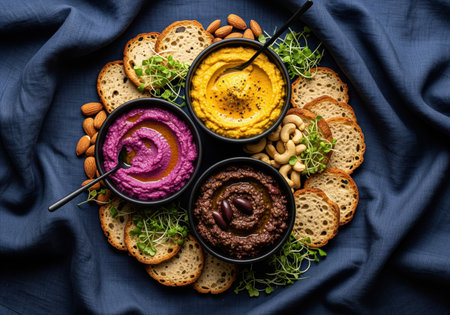 Three colorful gourmet dips, including yellow turmeric and purple yam, are served with toasted bread slices and assorted nuts on a dark fabric background.
