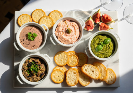 Overhead shot presents european gourmet pâtés and spreads on a marble board. accompanied by crackers, sliced bread, and figs, offering a sophisticated tasting experience.