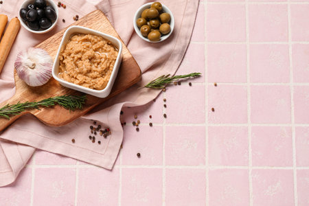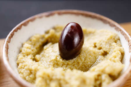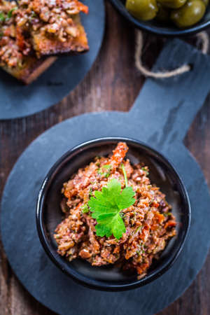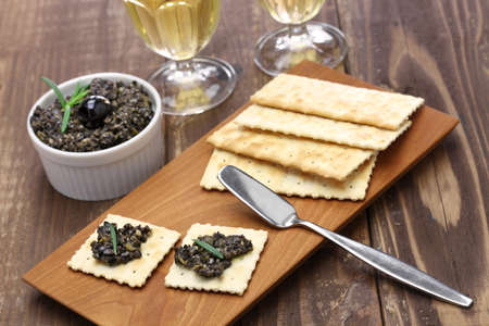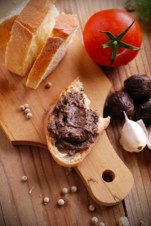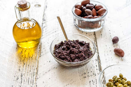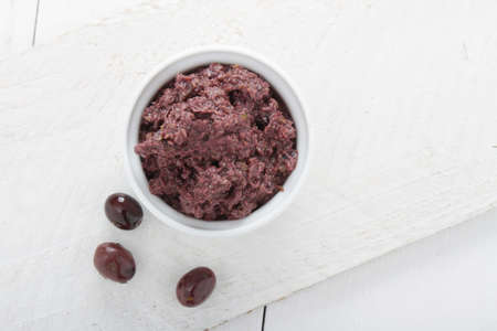 Black olive tapenade with anchovies, garlic and olive oil on wooden table