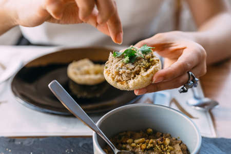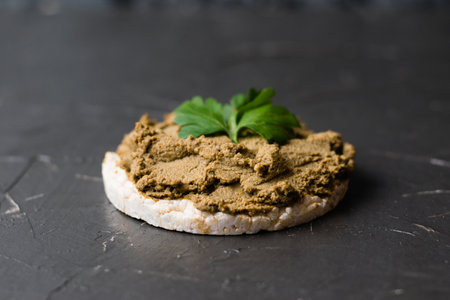 Healthy food, sandwich made of diet rice bread and beef liver pate, decorated with a parsley leaf, close-up on a dark background