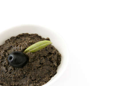 Black olive tapenade with anchovies, garlic and olive oil isolated on white background