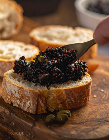 A close-up shot captures the moment a rich, dark olive and caper tapenade is spread onto a slice of rustic, crusty bread.