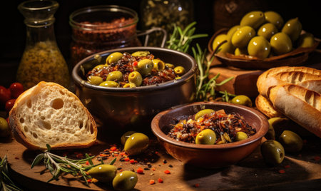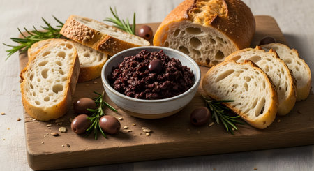 A culinary still life showcases artisan bread accompanied by olive tapenade on a wooden board. Rustic food photography highlights textures and colors. Rosemary sprigs and scattered olives enhance this rustic presentation. AI Generative AI generated