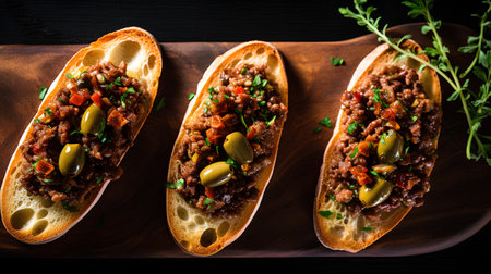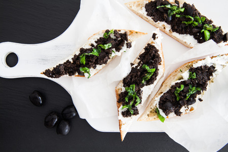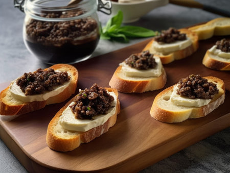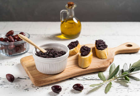 Fresh olive tapenade on toasted baguette slices glossy texture