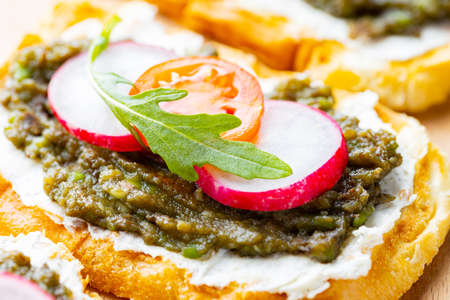 Vegan sandwiches with avocado cream. Healthy sandwiches with cream cheese, avocado, radish and cherry tomatoes