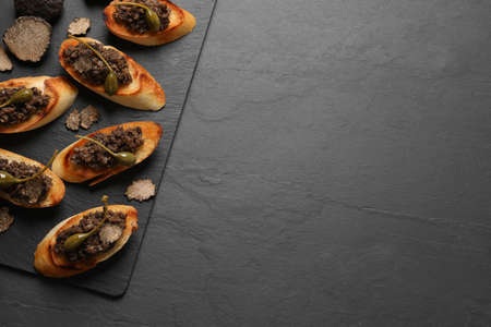 Tasty bruschettas with truffle paste and capers on black table, top view. Space for text
