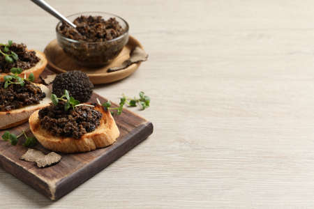 Delicious bruschettas with truffle sauce and microgreens on white wooden table. Space for text