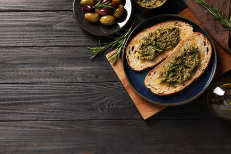 Tasty bruschettas with pesto and rosemary on black wooden table, flat lay. Space for text