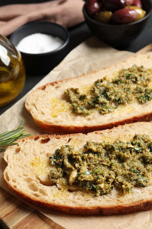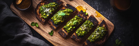 Mediterranean bruschettas with pesto and arugula served on wooden board with herbal salt and fabric on background with copy space. Traditional italian toasted bread with sauce and plants antipasti