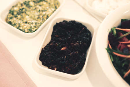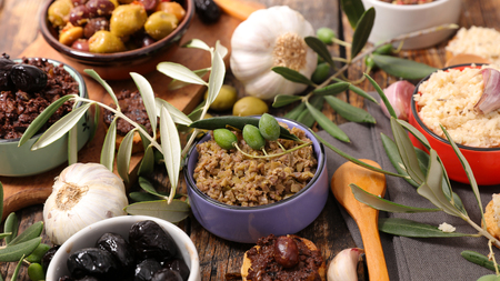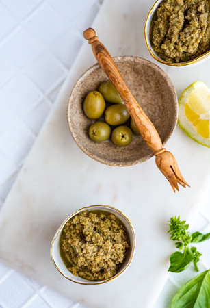 Table served with tapenade, mixed marinated olives (green, black and purple) in ceramic bowl and basil leaves. French provence appetizers and snacks. Close-up