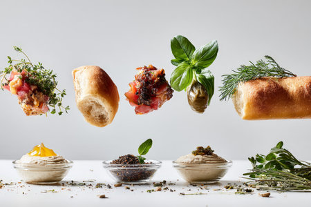 Floating baguette, herbs, hummus, and garnishes in culinary art display.