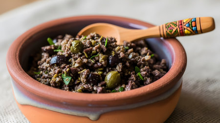 A rustic clay bowl filled with black olive tapenade and capers sits on a textured cloth, accompanied by a wooden spoon. The close-up shot highlights the coarse texture of the savory Mediterranean spread.