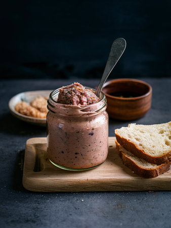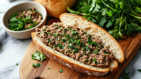 A delicious and hearty meat spread served on artisan bread with fresh herbs. Perfect for a savory snack, meal, or gathering with friends and family.