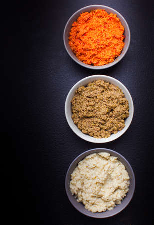 Overhead plates with three kinds of snack for spreading on bread or toast. Delicious homemade dip sauces on black background, top view