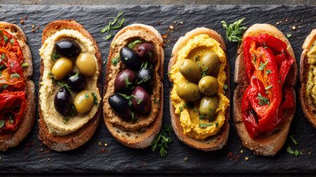 A beautiful selection of bruschetta topped with various olives and roasted peppers, perfect for gatherings or as a delightful appetizer at any event.