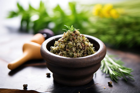 pressing sprig of rosemary on bruschetta covered in tapenade by hand, created with generative ai