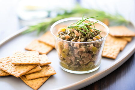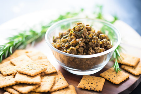 Crackers and olive tapenade in a sunlit setting on wooden board