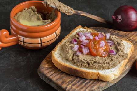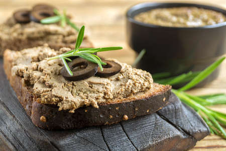 Fresh homemade chicken liver pate on ciabatta bread with roasted onions and olives on wooden table