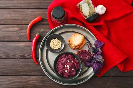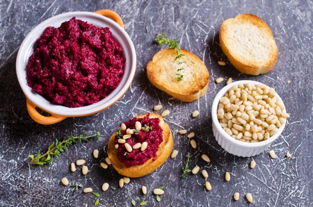 Sandwich with grated beets and nuts on a dark background. Selective focus.