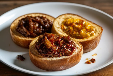A close-up of freshly toasted bread being smeared with colorful spreads, showcasing the textures of the bread and the toppings in a sunny kitchen setting.