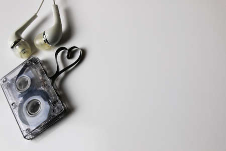 Transparent audiocassette surrounded by a cord of headphones in the shape of a heart on a white background