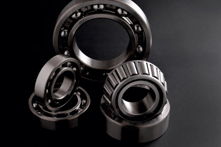 roller bearings stacked in a pyramid on a black background close-up selective focus