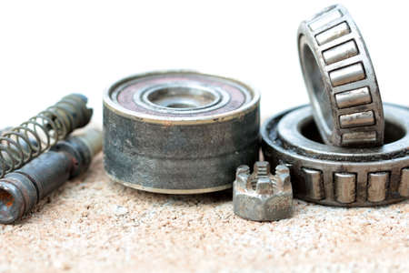 Old bearings and rollers in warehouses. Car parts in old warehouses. Used vehicle part for recycling in the scrap yard garage.