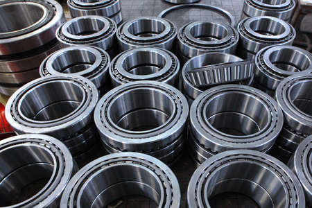 Large number of bearings. Finished products at the bearing plant. The view from the top. Concept of heavy industry. Photo at the factory. Copy space.