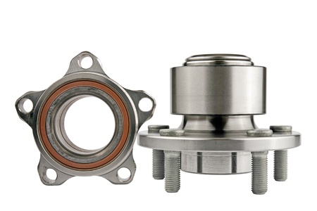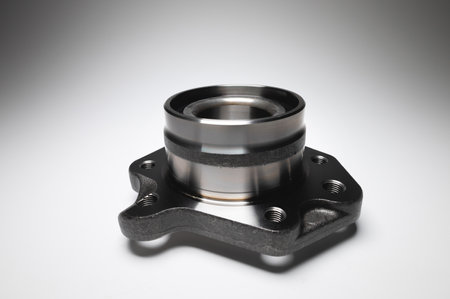 New wheel bearing in a metal housing on a black-white gradient background. New car suspension parts