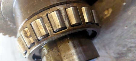 Close-up of a tapered roller bearing illustrating the intricate arrangement of rollers within a machinery setup. This component plays a crucial role in load distribution.