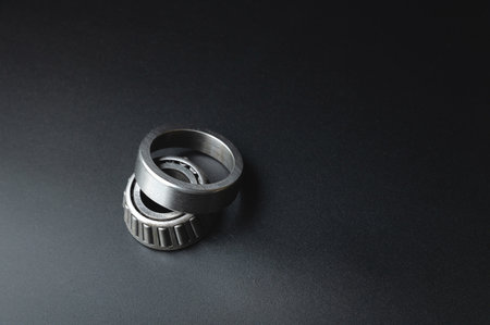 Tapered roller bearing close-up with copy space for your text. Spare mechanical part on a black background.