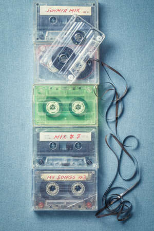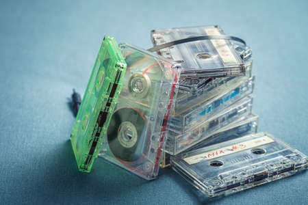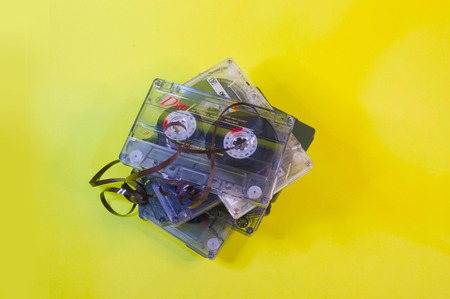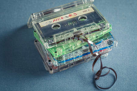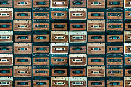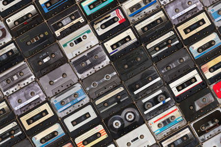 Old audio cassettes with retro music. View from above. Music media from previous years.