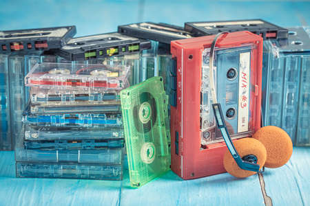Retro stack of audio cassettes as symbol of analog music. Cassette audio tapes with a red player and headphones.