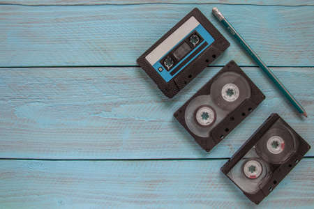 On a blue wooden background, there are three audio cassettes and a pencil. There is a space for text on the left side of the frame. Top view