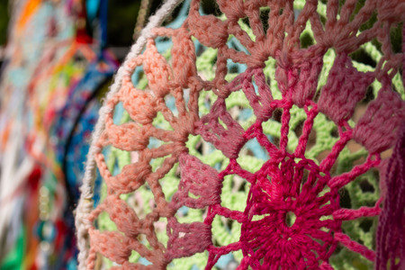 Dream catcher made of handmade colors hanging in the sun and moved by the wind. Typical handicrafts of Native Americans. Decoration made of woven wool.