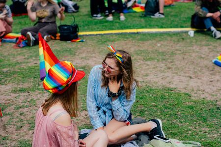 Helsinki, Finland - June 29, 2019: Two girls sitting on the grass on Helsinki Pride festival in Kaivopuisto public park