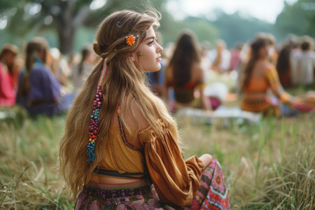 Indian inspired lanterns decorating outdoor yoga festival with people meditating