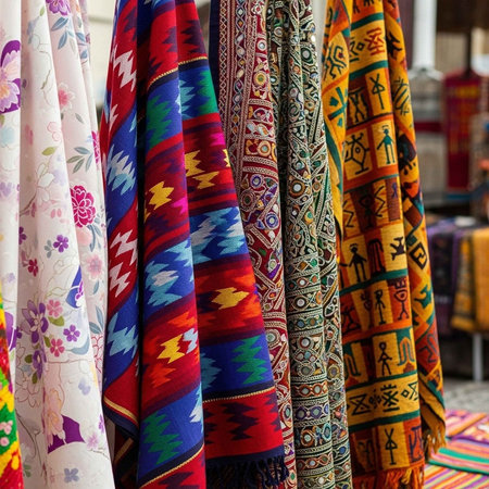 variegated multi colored fabrics in the Indian traditions at the exhibition