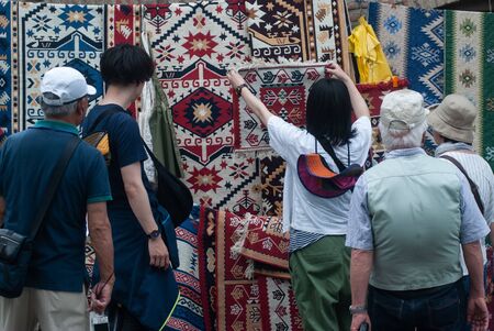 Georgian Souvenirs. Carpets. Tourists choose carpet,