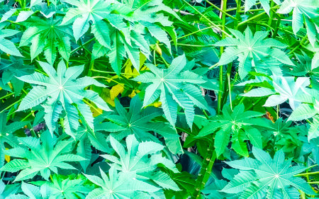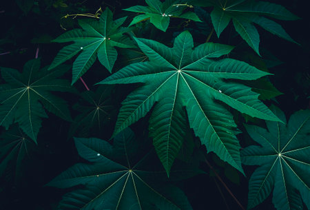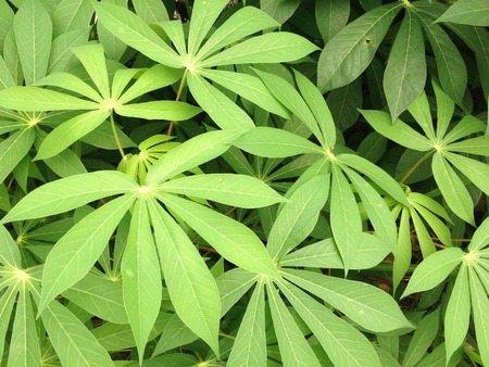 cassava leaves with sharp green veins pattern showing natural tropical foliage and healthy agriculture crop