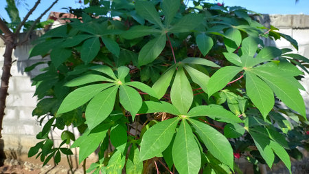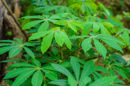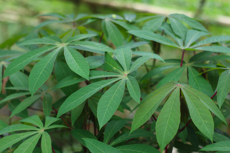 detailed closeup of fresh green cassava leaves with natural background in tropical farmland