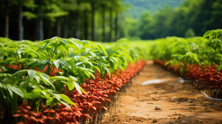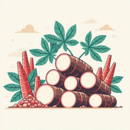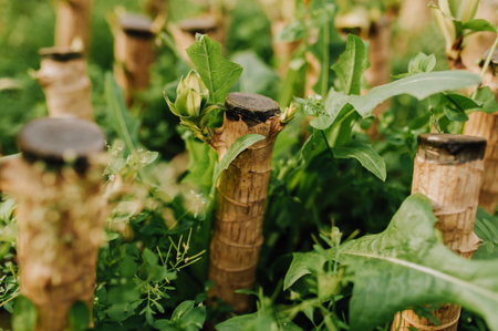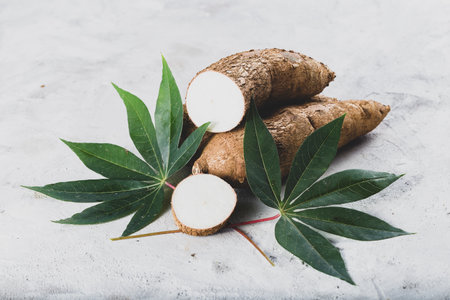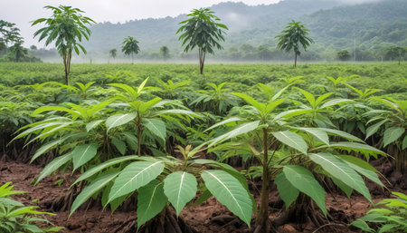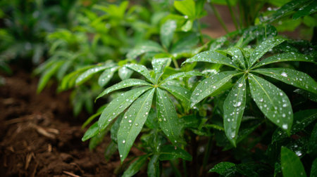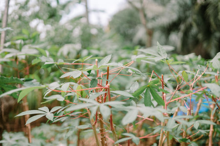 Lush green cassava roots emerge from vibrant foliage, highlighting the beauty of agriculture. A perfect representation of natural food cultivation in a tropical setting.